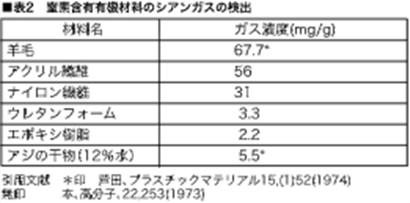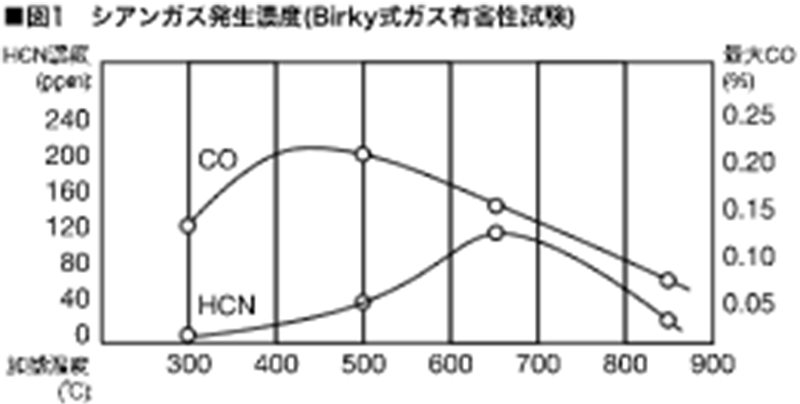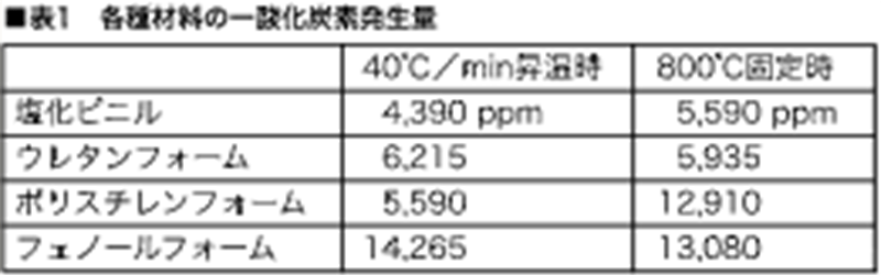 ウレタンフォーなど窒素原子を含む物質からは燃焼時にシアンガスが発生するので危険だという声があります。しかし、ウレタンフォームの燃焼試験では燃焼温度が低いときには一酸化炭素が多く発生し、燃焼温度が高くなるとシアンガスも発生することがわかります(図1)。実際の火災では初期の低温段階から、あらゆる可燃物の燃焼により多量の一酸化炭素が発生し、それがガス中毒死の原因になるのです。従って、燃焼に関してウレタンフォームなど窒素含有物質の特異性を指摘するのは正しくありません。むしろ、すべての可燃物から発生する一酸化炭素の問題を忌避した危険な意見と言えます。樹脂系断熱材の中には燃焼条件によりウレタンフォームよりも多くの一酸化炭素を発生させる材料もあるからです(表1)。しかし、私たちは断熱材に限らず、木材や布製品など多くの可燃物に囲まれ、これらの特性を生かせています。ウレタンフォームをはじめとした樹脂系断熱材は不燃内外装材と組み合わせることにより充分な防火性能を得、かつ本来の優れた物性を発揮して住宅の断熱性能向上に貢献します。