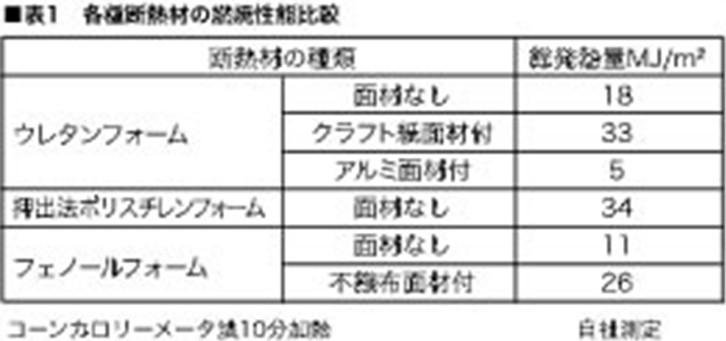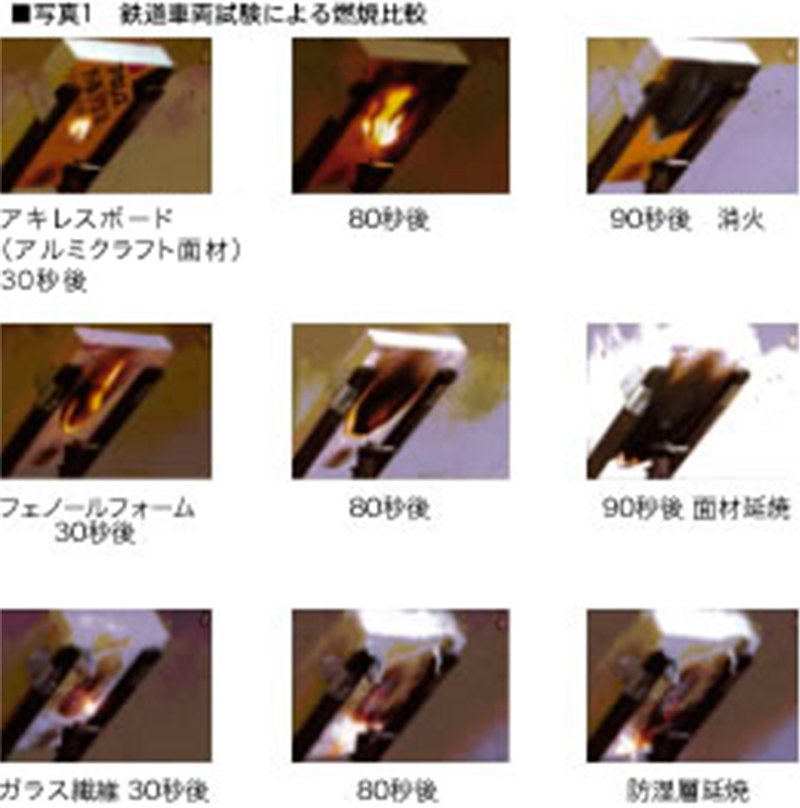 樹脂系断熱材は熱によって柔らかくなる熱可塑性樹脂と熱によって硬くなり炭化する熱硬化性樹脂に大別されます。前者の代表はポリスチレンやポリエチレン、後者の代表はウレタンやフェノールですが、両者間では燃焼性が大きく異なり、また個々の材質によっても異なります。そのため試験方法によっても燃焼性能の評価は異なったものになります。一方樹脂系断熱材の中には表面材を含む複合体で構成されているものも多く、材料の燃焼性能は当然この表面材を伴った状態で評価するのが実態に即していると言えます。表1は材料の燃焼性の評価で信頼性の高いコーンカロリーメータ試験の結果を示したものですが、樹脂単体の結果と、表面材との複合体としての結果は必ずしも一致していないことが解ります。これを視覚的に示したのが写真1の鉄道車両試験です。フォームの難燃性も重要ですが、複合製品としての表面材の燃焼性も火災には重要な要素となっています。キューワンボードやアキレスボードALNノンフロンの面材はアルミクラフト紙のため難燃性が高く、火源が消火すると同時に断熱材も消火します。しかし、一般にフォームの難燃性が高いと言われているフェノールや無機系のガラス繊維では、被覆する面材によっては燃焼するため、火源が消火しても直ちに消火せず、いつまでも面材が延焼する状態となるものもあります。フォーム単体の難燃性能だけでなく製品としての難燃性能を理解した上で、防火性を判断したいものです。