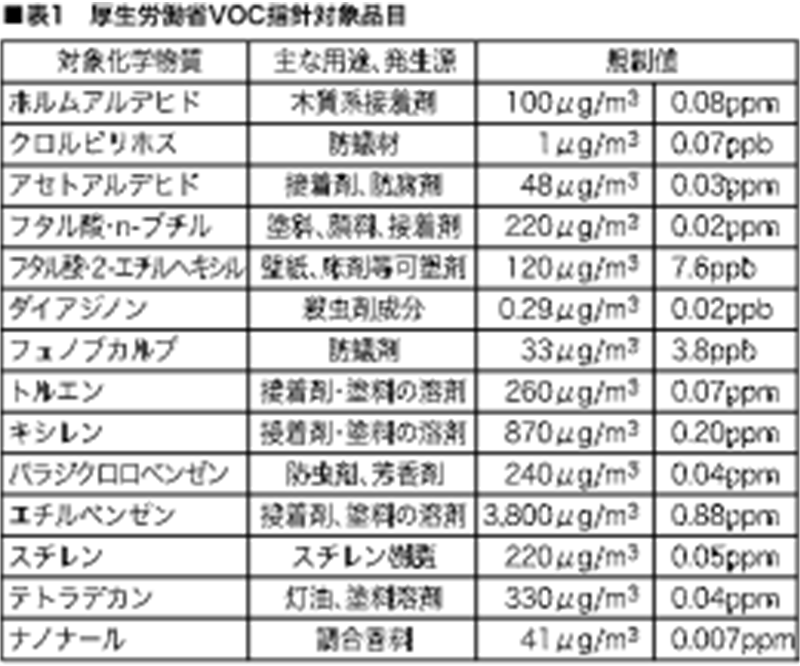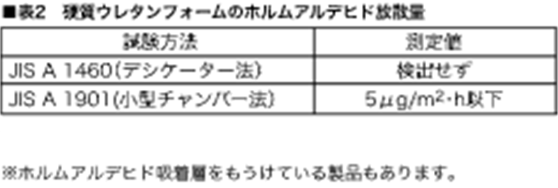 VOC(揮発性有機化合物)にはたくさんの種類がありますが、このうちすでに規制されているもの、あるいは今後規制が予想されるものは表1の通りです。このうち、7月施工のシックハウス法で規制されるホルムアルデヒドは樹脂系断熱材では、フェノールフォーム、ユリアフォームなどから放散される可能性があります。これら尿素系樹脂はホルムアルデヒドが原料であり、未反応の残留分があるためです※。そのほかグラスウール、ロックフールなどの繊維系断熱材は無機物なので本来はVOCには関係ないはずですが、接着剤(バインダー)として尿素やフェノールを使用しており、これら接着剤からホルムアルデヒドが放散されるのです。そのためこれらの断熱材は合板や木質系ボード類とともに「第一種ホルムアルデヒド発散建材」に定められています。ホルムアルデヒドの放散量を試験する方法として従来からのJIS A 1460(デシケーター法)の他にJIS A 1901(小型チャンバー法)が新たに定められました。上記ホルムアルデヒド発散建材はシックハウス法による使用制限を受けないようにするためには、原則として小型チャンバー法試験による個別認定でF☆☆☆☆等級を取得しなければいけません。硬質ウレタンフォームはホルムアルデヒド発散建材ではありませんから、こうした個別認定を受ける必要はありません。小型チャンバー法は非常に精緻な測定法なので空気中のごく微量のホルムアルデヒドを感知し、測定値がゼロということはありません。